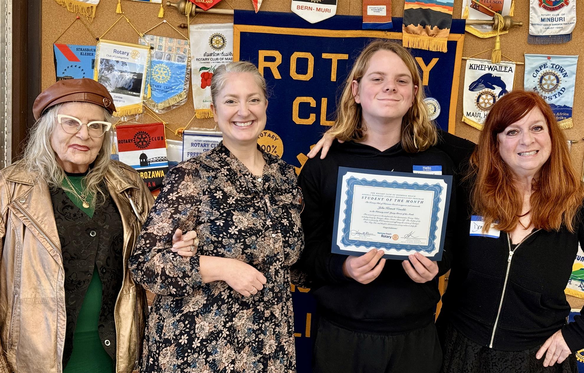 Kennett and mom Denise beam next to Principal Bledsoe and Rotary President Angie at the February Students of the Month luncheon. A drummer in the HVS Jazz Band, Kennett is looking forward to the upcoming Glenn Miller Orchestra performance March 10 (see next article). Identified as "Creative" by his teachers, Kennett also enjoys art, including helping out at Sunrise Assisted Living with resident art projects. But he doesn't stop there. He is a proud participant in the Math Olympiad, and rounds out his academics with a love of Social Studies. Congratulations, Kennett!